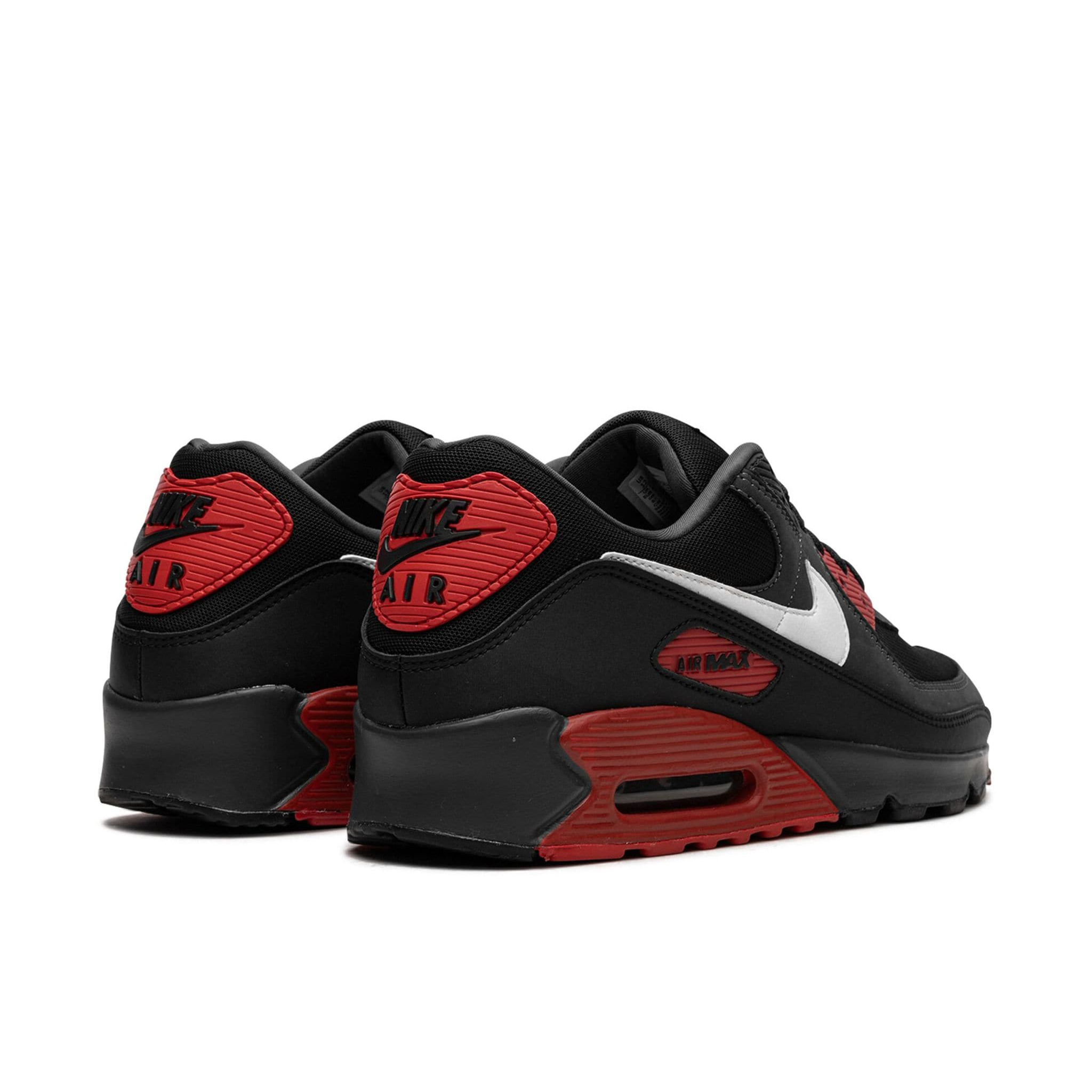 These Nike Air Max 90 sneakers feature a stunning combination of black and fiery red hues. The black textile base is complemented by a tonal nubuck mid-panel and mudguard, while a white leather Swoosh on both sides adds to the shoe's overall aesthetic. Furthermore, the midsole flaunts a red-coloured panel with a visible Air cushioning unit.