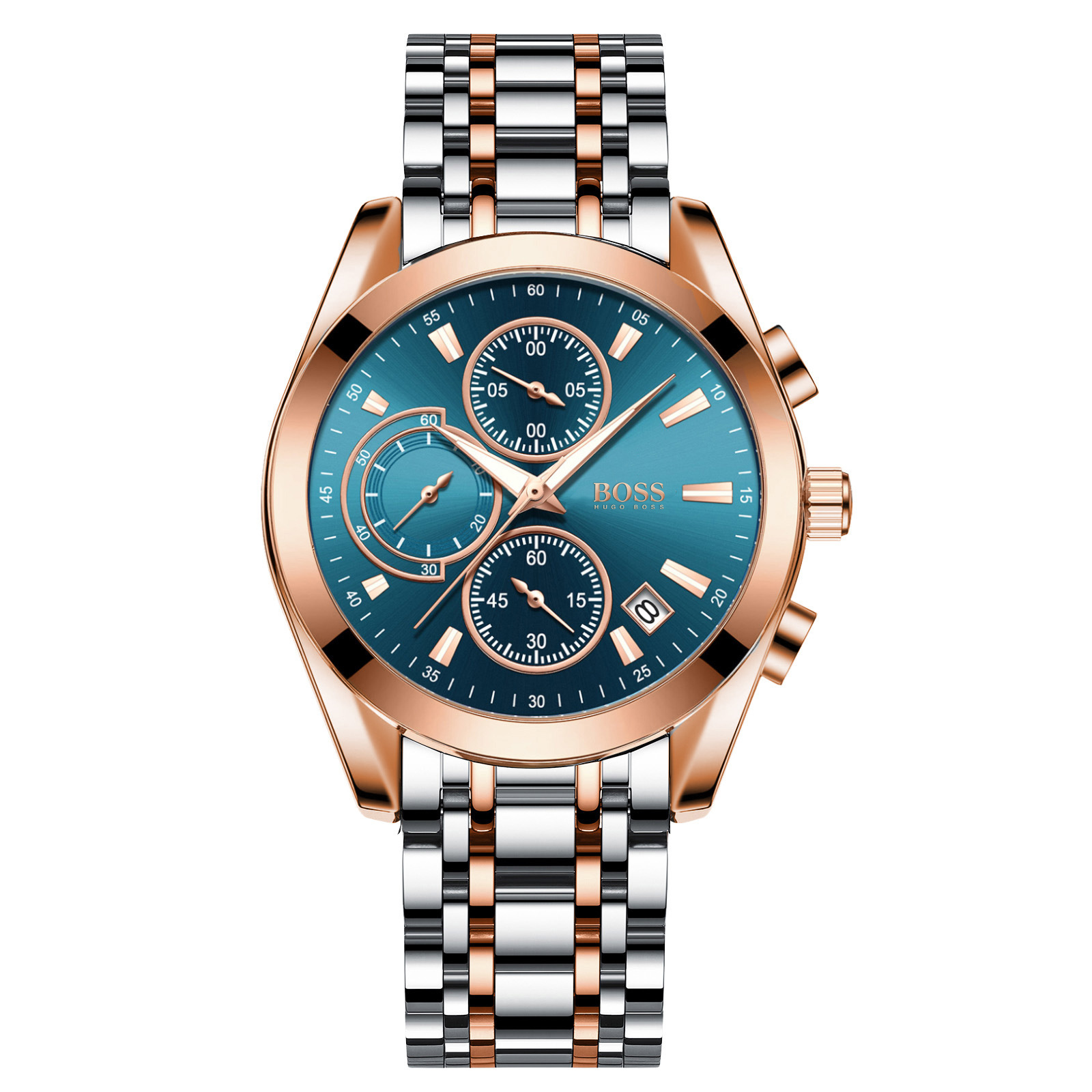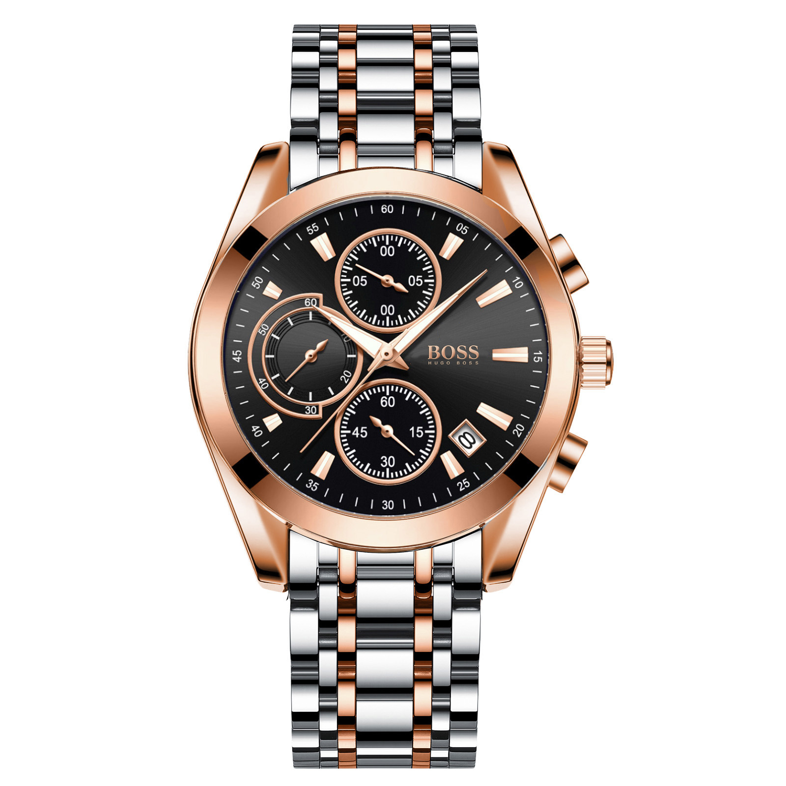 Moška ura Hugo Boss je opremljena z delujočimi kronografi: minute štoparice, sekunde štoparice, 24-urni prikaz časa in datuma dni v mesecu