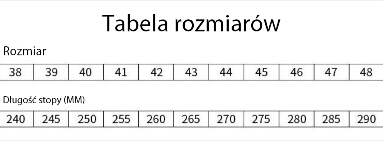Oto prosta tabela rozmiarów Obuwia Męskiego z polskimi rozmiarami, rozmiarami i modelami oraz dƂugoƛcią stopy w mm.